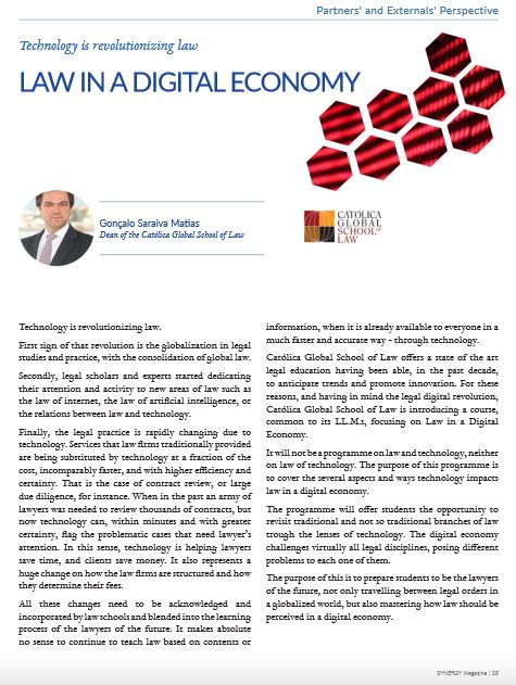 Law in a Digital Economy is the topic of te article written bt Gonçalo Saraiva matias, the Dean of Católica Global School of Law, to Synergy magazine.